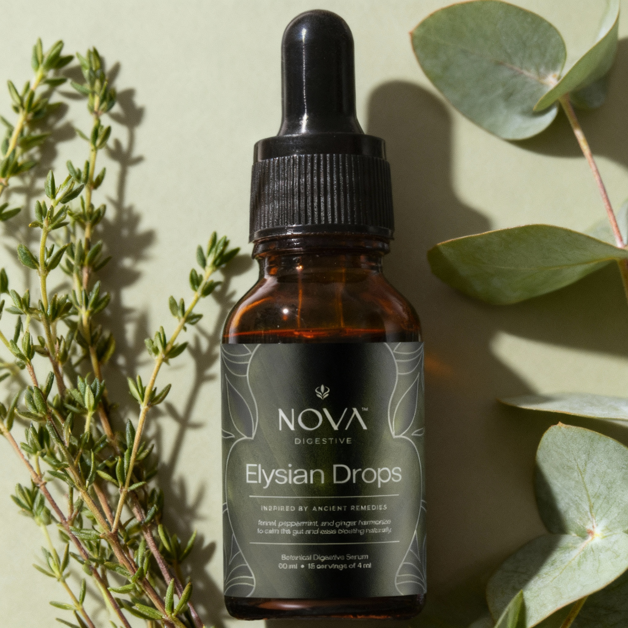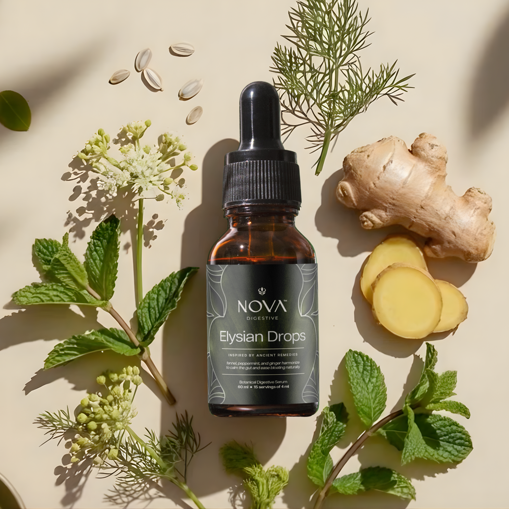Every drop of Elysian Drops is crafted from organic herbs and minerals — fennel, peppermint, ginger, and magnesium — carefully blended to support digestion, calm your system, and restore balance naturally.
