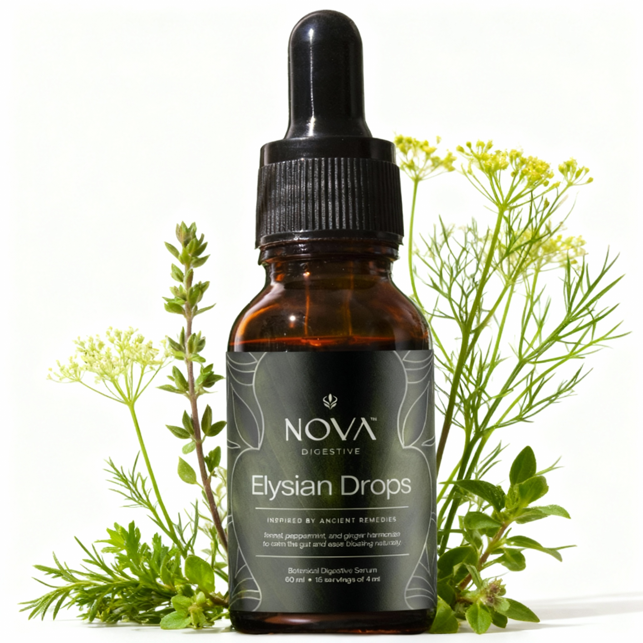Every drop of Elysian Drops is crafted from organic herbs and minerals — fennel, peppermint, ginger, and magnesium — carefully blended to support digestion, calm your system, and restore balance naturally.